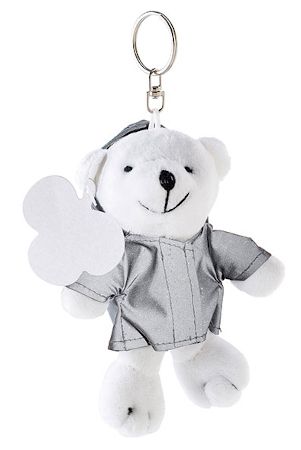 Porta-chaves em forma de urso com colete reflector. Medidas: 11,7x8,6x4,5cm.