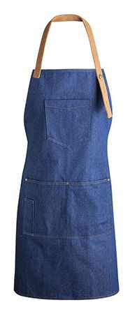 Avental de qualidade em ganga com bolso, costuras reforçadas, remates metálicos.