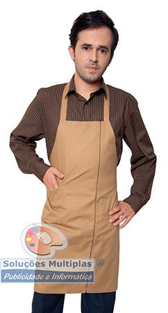 Avental com tira ajust]avel na gola(duas posições). Duas tiras nas extremidades para ajustar a peça. 3 bolsos: 2 bolso no peito, 1 bolso central com 2 compartimentos. Materiais: Sarja, 65% poliéster, 35% algodão, 190grs. Tamanhos: Único.