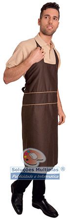 Avental comprido com tira única que passa pelo pescoço e laterais, para ajustar o avental.