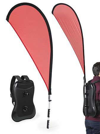 Mochila porta-bandeira em poliéster, alumínio e fibra de vidro. Medidas: 70 x 170 cm. Peso: 930gr.