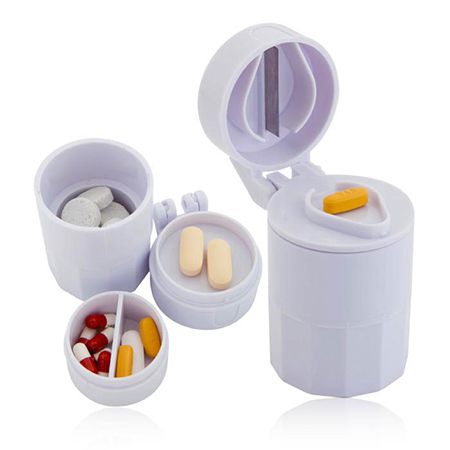 Caixa para comprimidos com vários em forma cilindrica compartimentos e lâmina para corte.