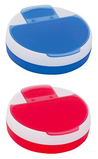 Caixa de comprimidos redonda com 4 compartimentos em plástico. Disponível em 2 cores.