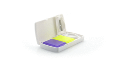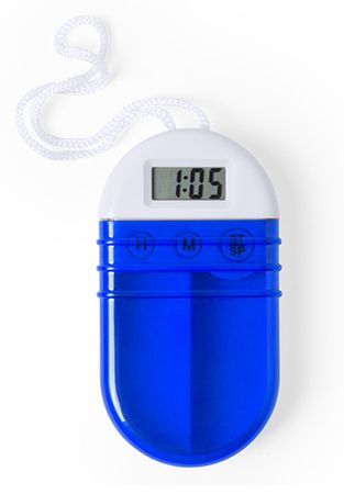 Caixa de comprimidos com temporizador em plástico. 2 divisórias e pilhas incluídas. Disponível em 2 cores.