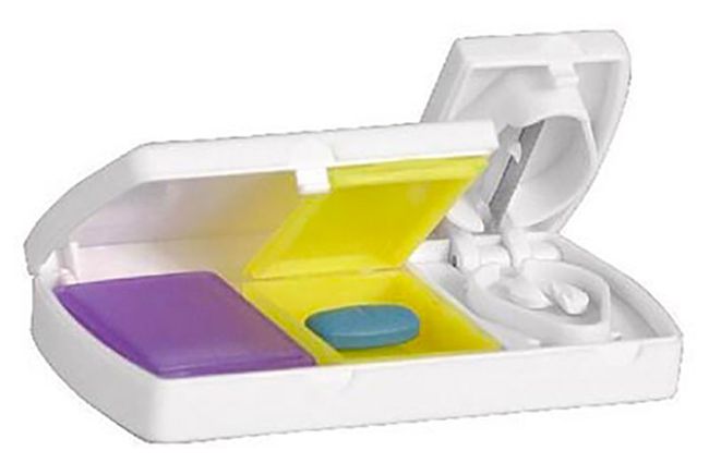 Caixa de comprimidos, com compartimentos amovíveis e com lâmina para corte.