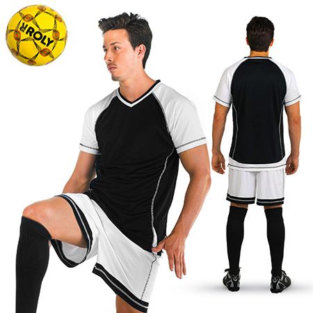 Conjunto adulto desportivo unisex composto por 2 camisolas de mangas curtas + 1 calção. Mangas curtas com vivo largo a contrastar. A cor da segunda camisola de mangas curtas compõe as cores invertidas. Gola redonda com debrum de cor dupla, com cobre costuras reforçadas no interior. Calções com cós elástico com cordão interior a combinar com a costura de segurança. 100% poliéster, 140 g/m². Tamanhos: M, L, XL, XXL.