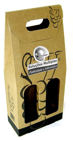Saco de cartão 2 garrafas, cor Kraft, com impressão decorativa e janelas.
